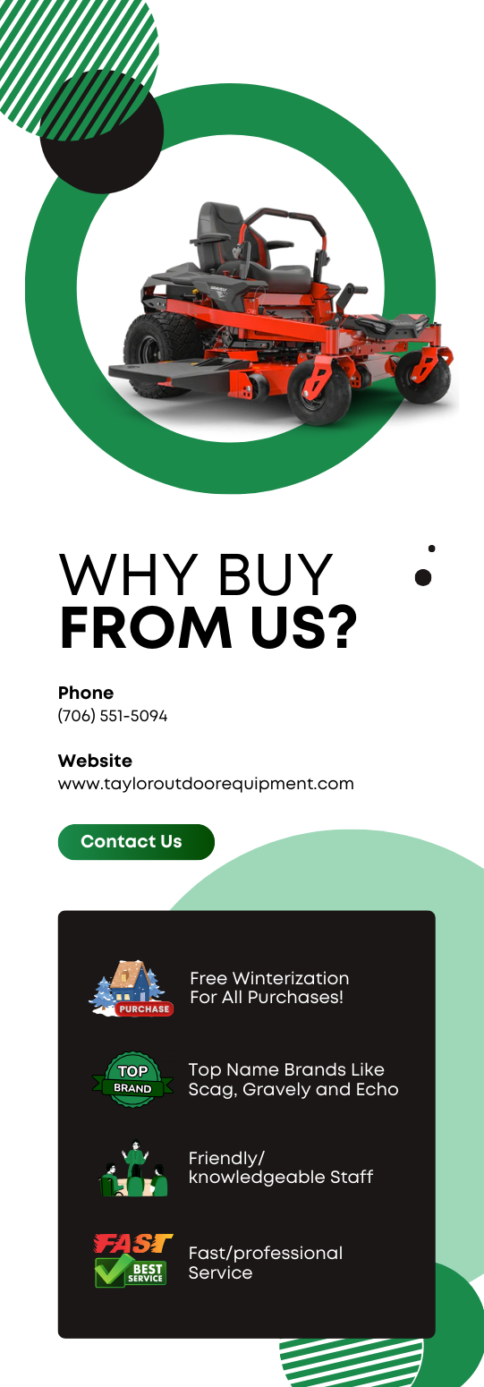 Taylor Outdoor Power Equipment located in historic Waynesboro, GA is Burke County's largest Outdoor Power Equipment Dealer specializing in consumer and commercial lawn mowers, zero turns, string trimmers, blowers, chain saws and more. We repair every major brand of outdoor power equipment! An authorized dealer for Scag, Spartan, Echo, Ariens and Gravely as well as Briggs & Stratton, Kohler, Kawasaki, MTD, and Hydro Gear. Our state of the art service facility keeps you running in a timely and professional manner!